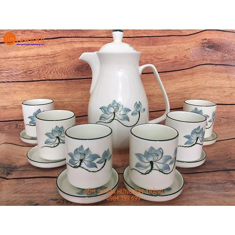 Bộ bình nước men kem vẽ sen xanh gốm Gia Hưng Bát Tràng