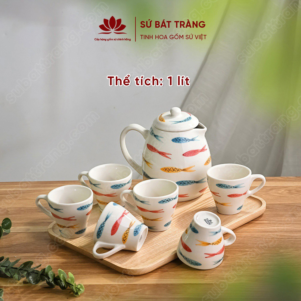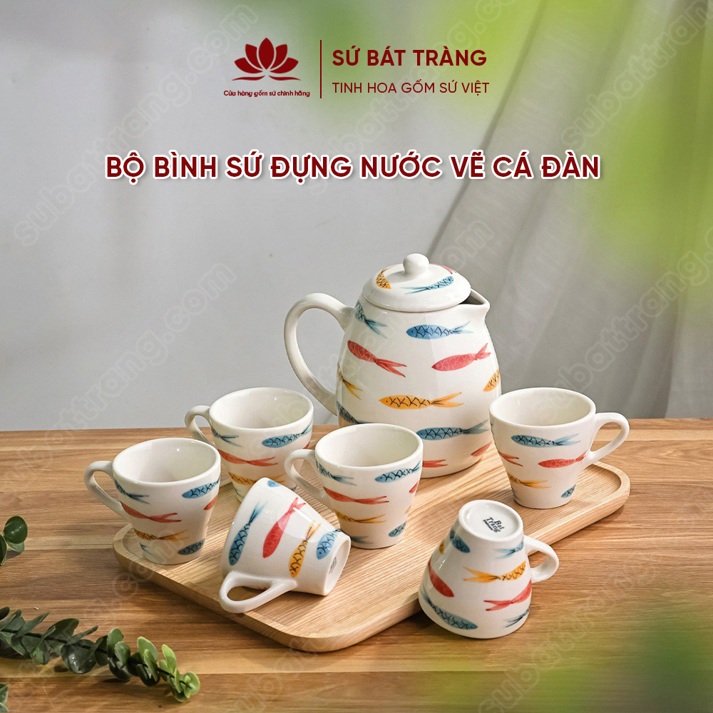 Bộ bình nước với họa tiết đàn cá được các nghệ nhân vẽ bằng tay 100%, đem đến sự độc đáo và khác biệt so với sản phẩm in công nghiệp khác trên thị trường.