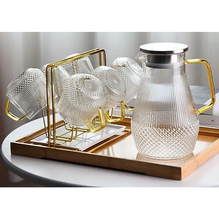 Bộ bình thủy tinh đựng nước uống kèm 6 cốc quai vàng chịu nhệt cao cấp - ANTH503