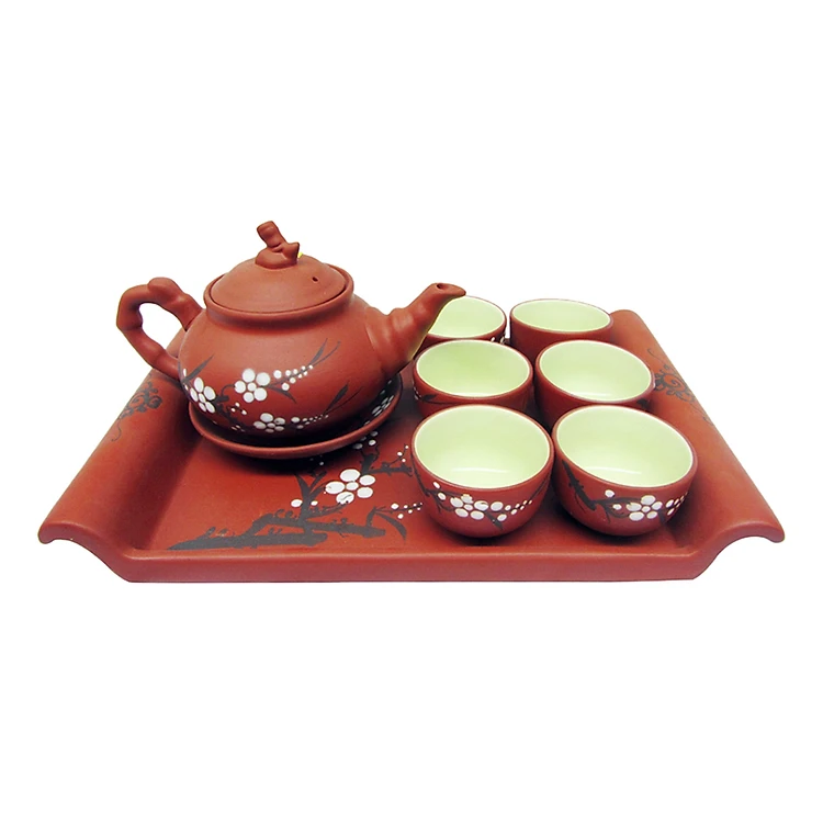 Bộ Bình Trà Đỏ Hoa Đào Khay Gốm Gốm Sứ Bát Tràng T706