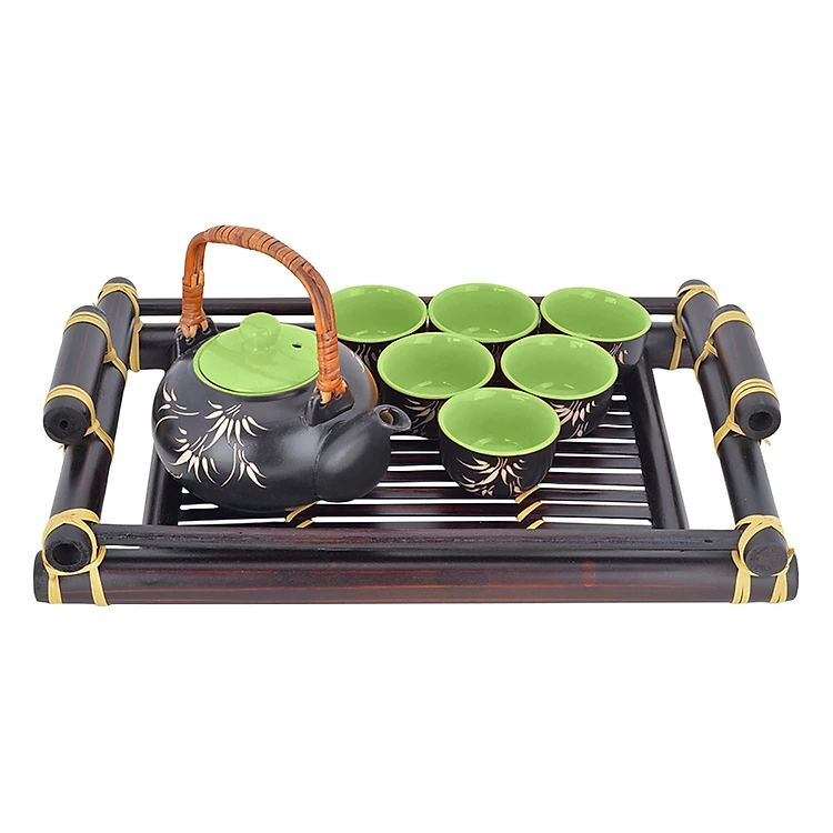 - Bộ bình trà bao gồm có 1 bình trà lớn, 6 ly uống nước và khay tre, thiết kế sang trọng, màu sắc tinh tế. Quai xách chắc chắn được đan bằng mây tre nhằm tăng tính thẩm mỹ cho bộ sản phẩm.