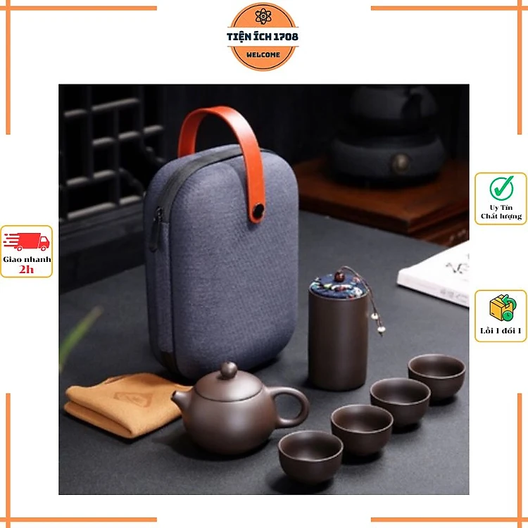 Bộ Bình Trà Tử Sa Mini Có Túi Đựng Đi Du Lịch Tiện Lợi Thích Hợp 2 - 4 Người Dùng Gồm 1 Ấm Trà, 4 Tách, 1 Bình Đựng Trà