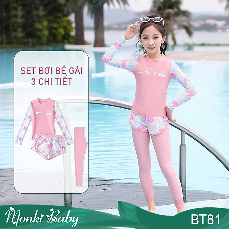 Bộ bơi bé gái chống nắng, đồ tắm 3 chi tiết tay dài quần dài xinh xắn trẻ trung cá tính, áo có đệm ngực, chất thun bơi lạnh Lycra dày đẹp | BT81