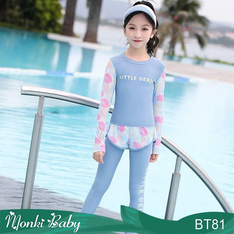 Bộ bơi bé gái chống nắng, đồ tắm 3 chi tiết tay dài quần dài xinh xắn trẻ trung cá tính, áo có đệm ngực, chất thun bơi lạnh Lycra dày đẹp | BT81