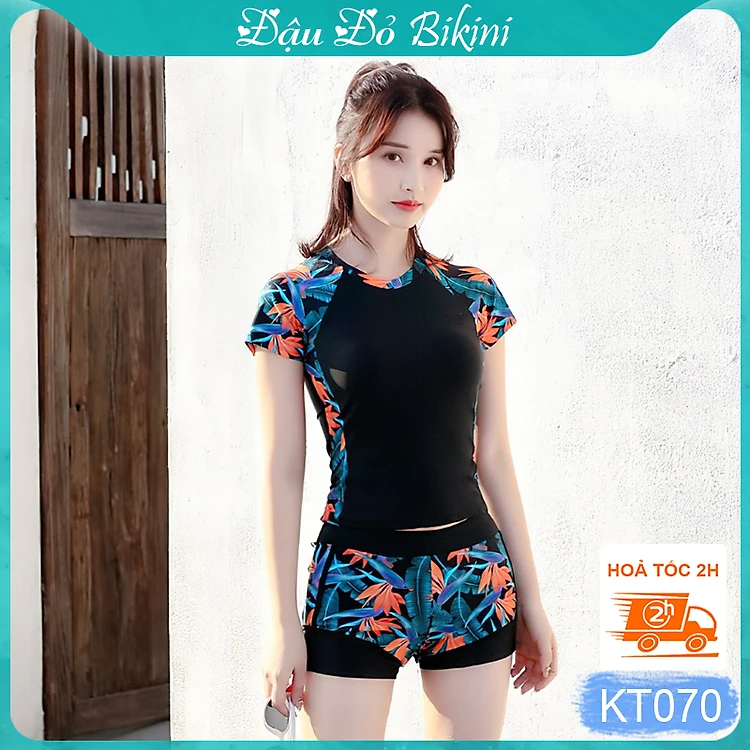 Bộ bơi nữ 2 mảnh thông dụng, áo cộc tay cùng quần bơi short 2 lớp trẻ trung, chất thun bơi lạnh co giãn cao, có sẵn đệm rời | KT070