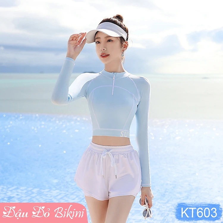 Bộ bơi nữ trẻ trung cá tính, áo crop top dài tay kín đáo có khóa kéo trước, quần bơi 2 lớp thể thao hiện đại, thun bơi lạnh mịn đẹp | KT603