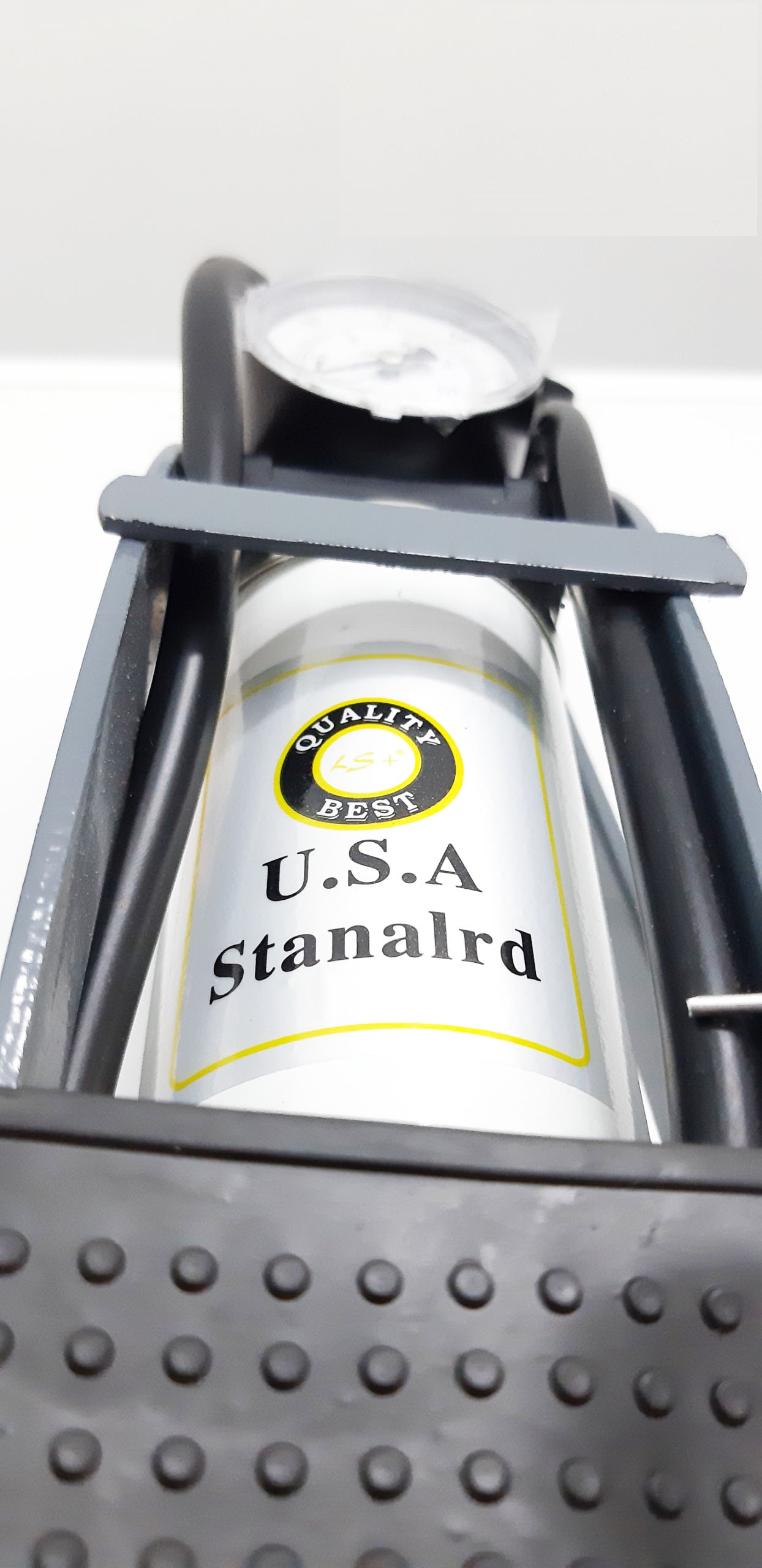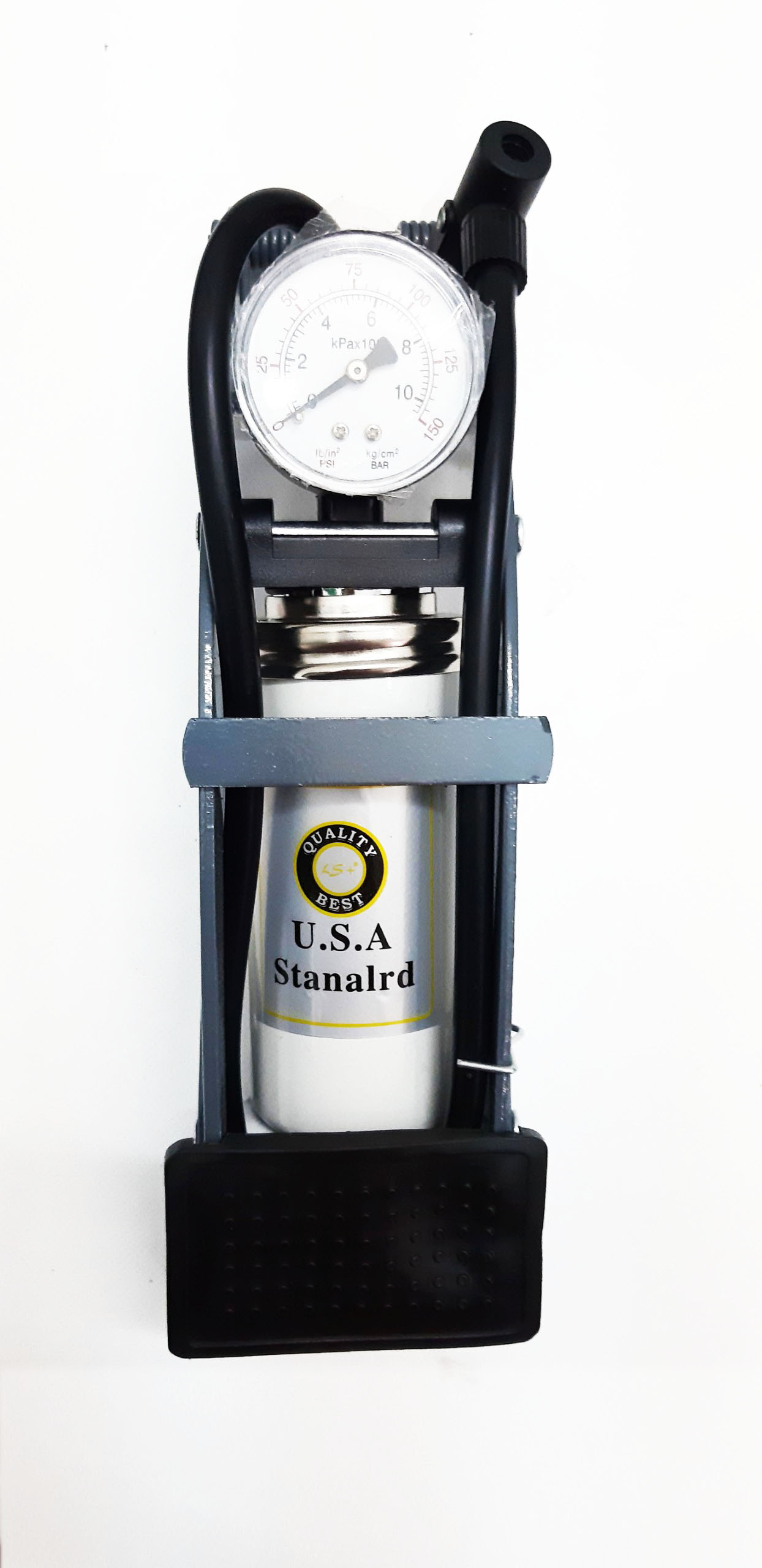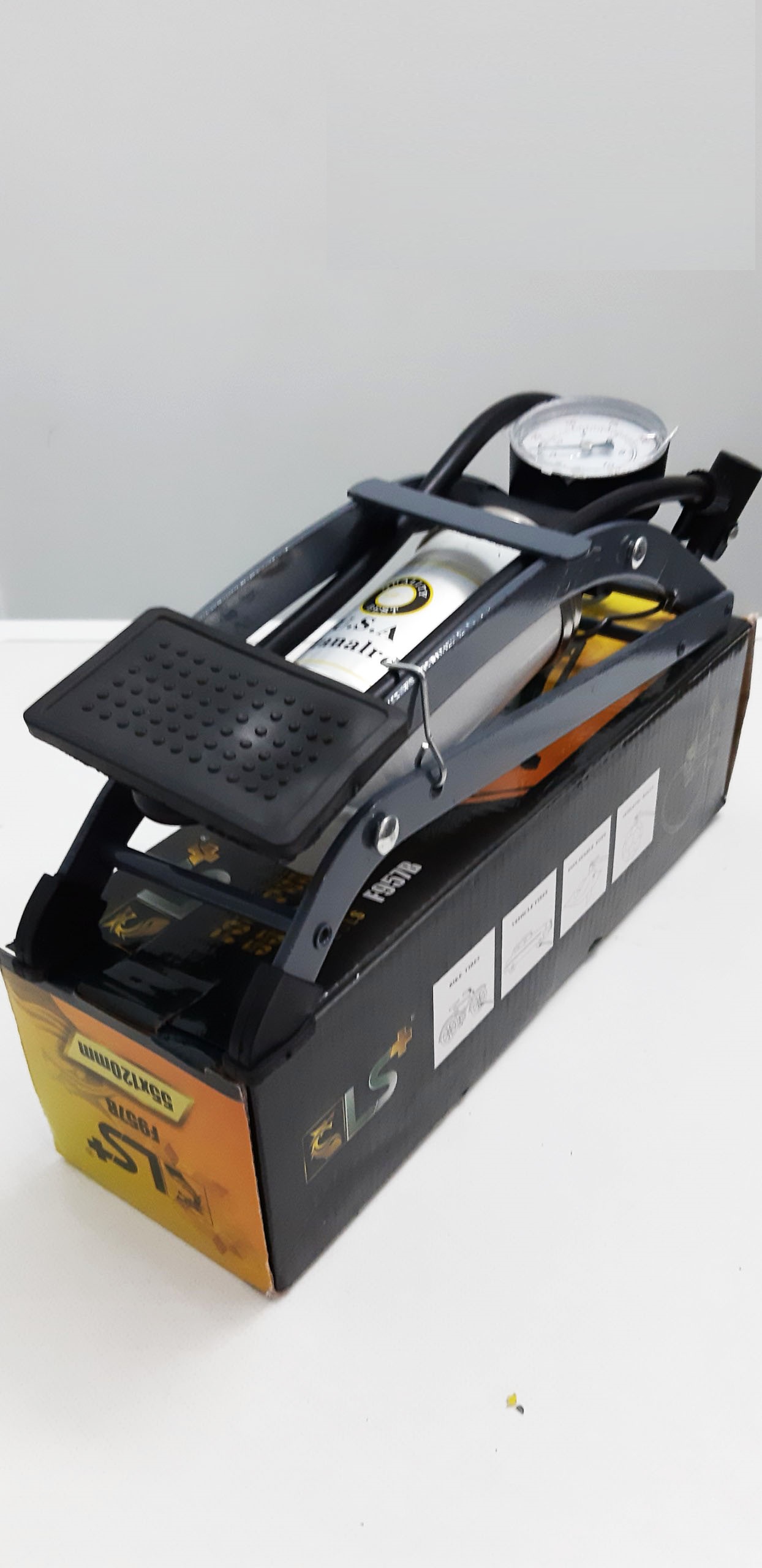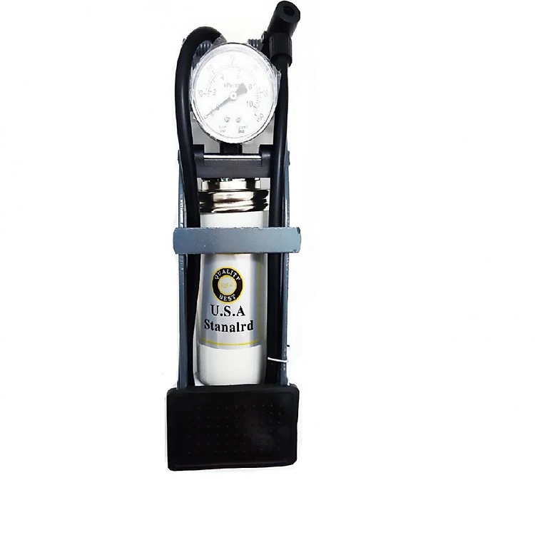 Sản phẩm ống bơm gồm: Đồng hồ đo áp suất, bàn đạp, dây dẫn và dụng cụ bơm đạp