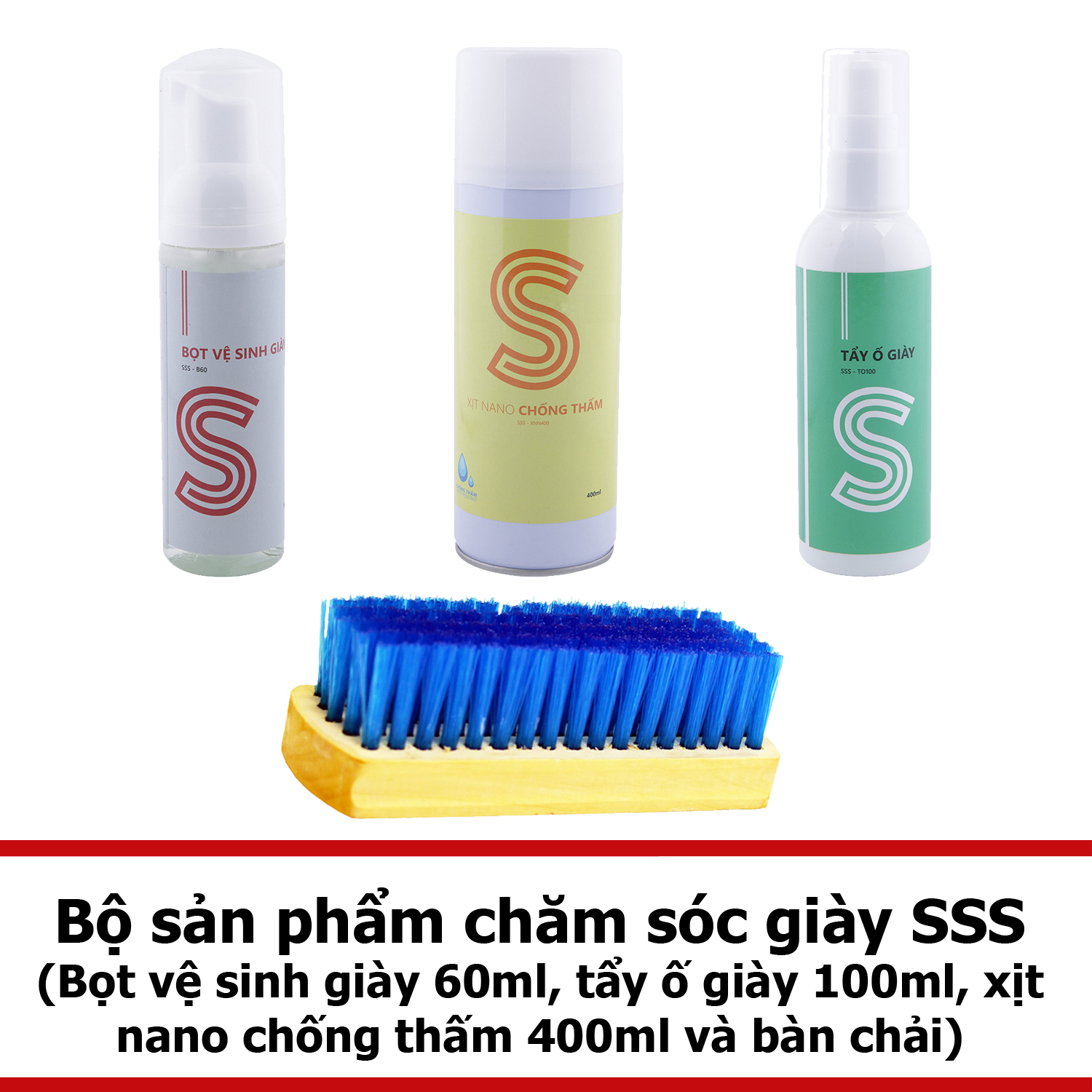 Giới thiệu bộ sản phẩm bọt vệ sinh giày 60ml, tẩy ố giày 100ml, xịt nano chống thấm 400ml và bàn chải COMBOSSS4