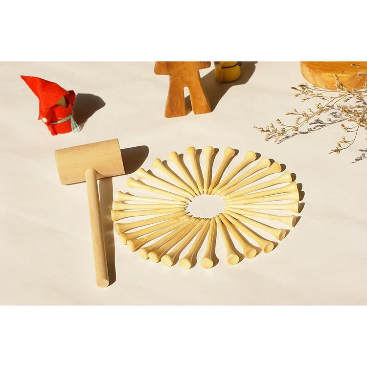 Bộ sản phẩm gồm 1 búa bằng gỗ và 30 chiếc đinh bằng tre chắc chắn được gia công tỉ mỉ an toàn cho bé, có thể rửa bằng nước và sử dụng nhiều lần.