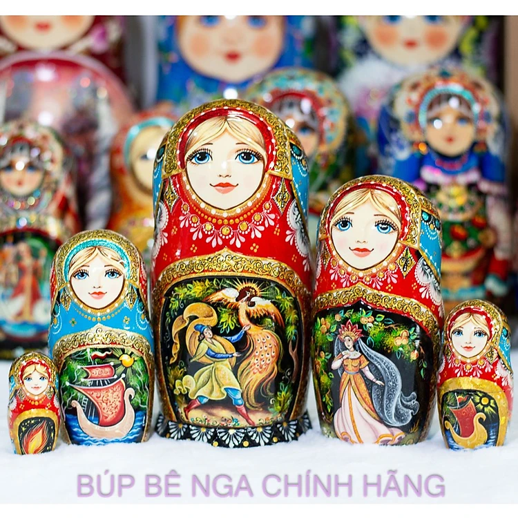 Bộ búp bê Matryoshka này vẽ câu chuyện cổ tích về chàng Ivan và chim phượng hoàng lửa. Những con búp bê truyền thống được làm thủ công bằng kỹ thuật hàng thế kỷ của những bậc thầy điêu luyện về nghệ thuật dân gian Nga.