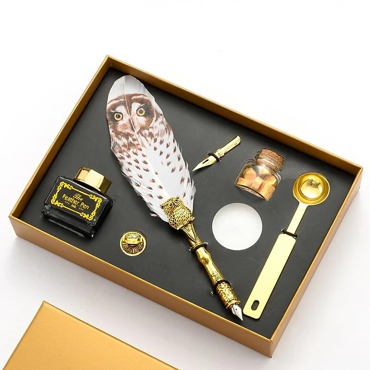 Bộ bút chấm mực gắn lông vũ mặt cú Kèm phụ kiện sáp niêm phong, phong cách hoàng gia