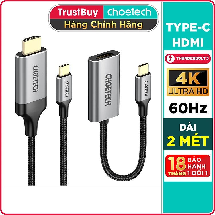 Bộ Cáp Type C to HDMI Phân Giải 4K 60Hz Dài 1.8M Kèm Đầu Chuyển C to HDMI Thunderbolt 3 CHOETECH CH0033-BK - Hàng Chính Hãng