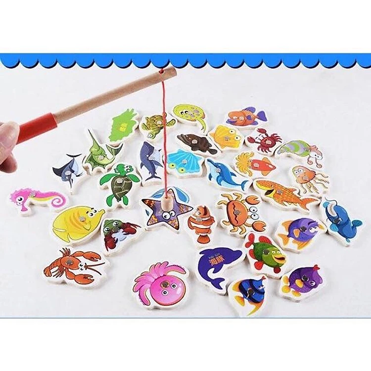 - Bộ câu cá bằng gỗ có nam châm cho bé giúp bé vui chơi thỏa thích đồng thời nhận biết các loại sinh vật biển khác nhau.