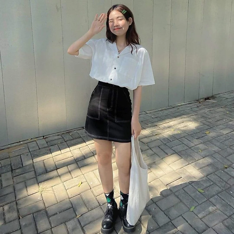 Bộ Chân Váy Bò Áo Sơ Mi Trắng