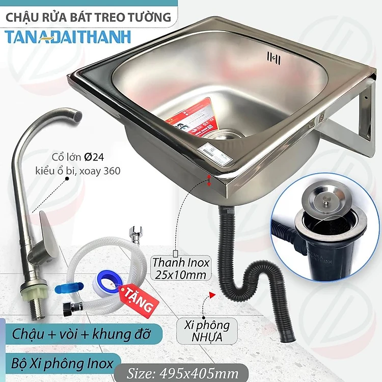 Bộ Chậu Rửa Chén Bát Treo Tường Inox TÂN Á ĐẠI THÀNH Kèm Vòi Lạnh - Mua đủ bộ Tặng dây cấp, keo lụa, đầu nối ống xả