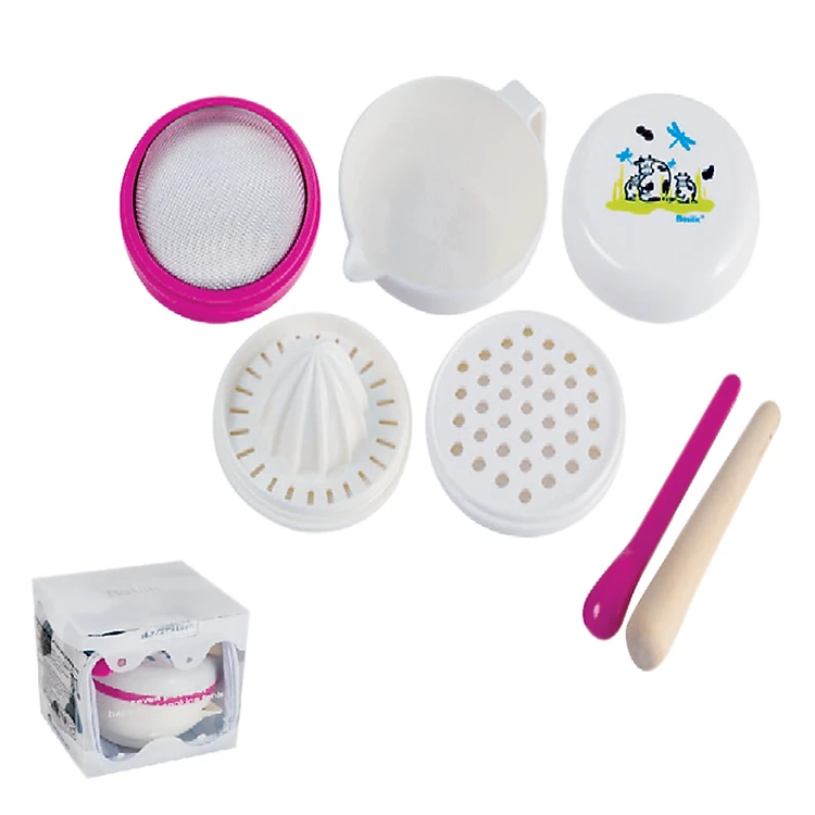 - Bộ Chế Biến Ăn Dặm Basilic D122 gồm 8 dụng cụ chuyên biệt giúp chế biến thức ăn cho bé đúng chuẩn. Bộ chế biến ăn dặm bao gồm: cối, chày, bát, rây lọc, bàn mài, dụng cụ vắt trái cây, thìa. Mỗi dụng cụ đều có chức năng riêng hỗ trợ bạn chế biến món ăn cho bé đơn giản hơn.