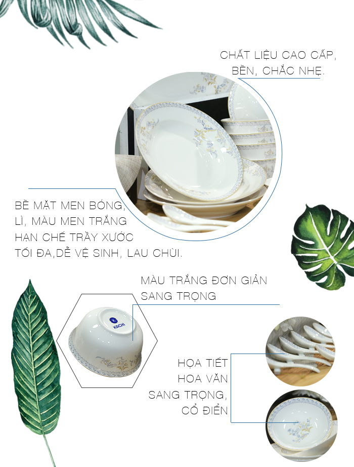 Bộ chén bát gốm sứ cao cấp được làm tư chất liệu cao cấp, bền, chắc nhẹ. Bề mặt men bóng, lì, màu men trắng hạn chế trầy xước tối đa, dễ vệ sinh, lau chùi, tiết kiệm thời gian và công sức cho người sử dụng. Sản phẩm càng có độ sáng bóng nhất định, càng làm toát lên sự tinh tế, sang trọng và tiện dụng, là sự lựa chọn tối ưu cho những người biết hưởng thụ ẩm thực nói riêng và cuộc sống nói chung.
