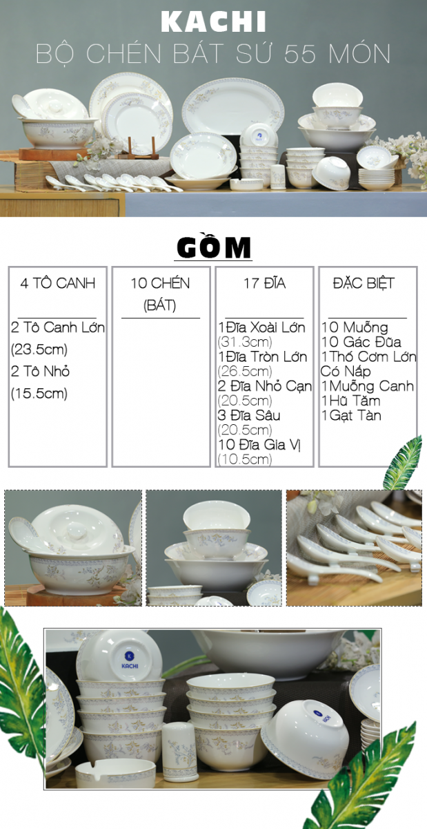 Vì thế, bữa ăn không chỉ cần có những món ăn ngon trong không khí vui vẻ, mà còn cảm giác ngon miệng từ những bộ đồ dùng ăn, như chén, đĩa, muỗng. Và hiện bạn đang mong muốn mua được những bộ đồ dùng ăn sang trọng, với mức chi phí hợp lý, hãy tham khảo Bộ bát chén sứ cao cấp 55 món Kachi của chúng tôi ngay dưới đây nhé!