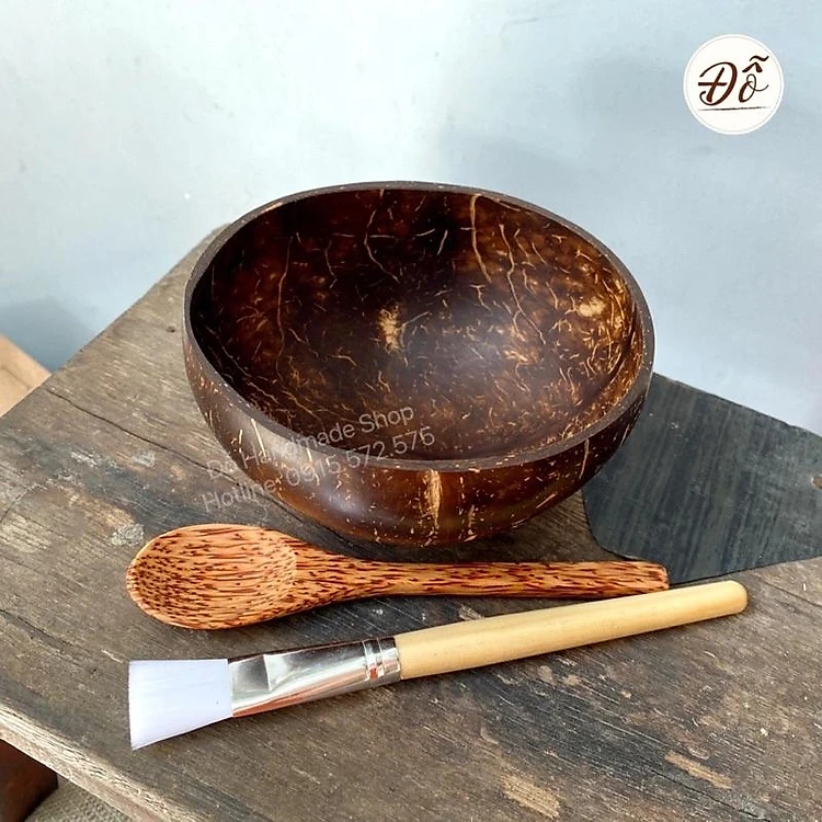 Bộ chén gáo dừa+ cọ cán gỗ + muỗng gỗ dừa 17cm,bộ dụng cụ trộn mặt nạ tiện dụng