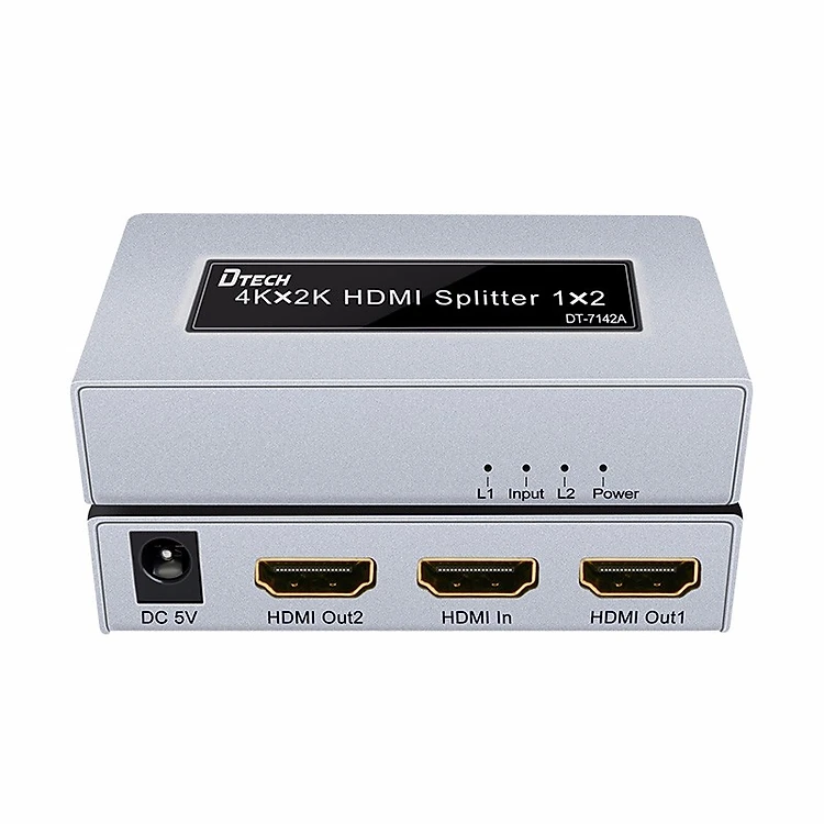 - Bộ chia HDMI 2 cổng hỗ trợ trình chiếu 4K*2K DT-7142 hỗ trợ 1 cổng vào tín hiệu HDMI và cho phép mở rộng, xuất tín hiệu ra 2 cổng đồng thời cùng lúc mà không hề bị suy hao tín hiệu