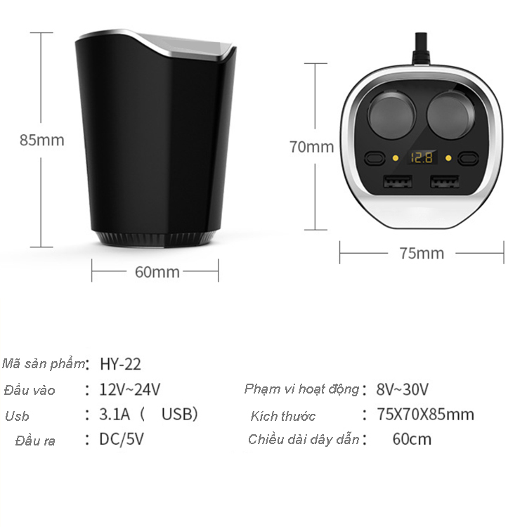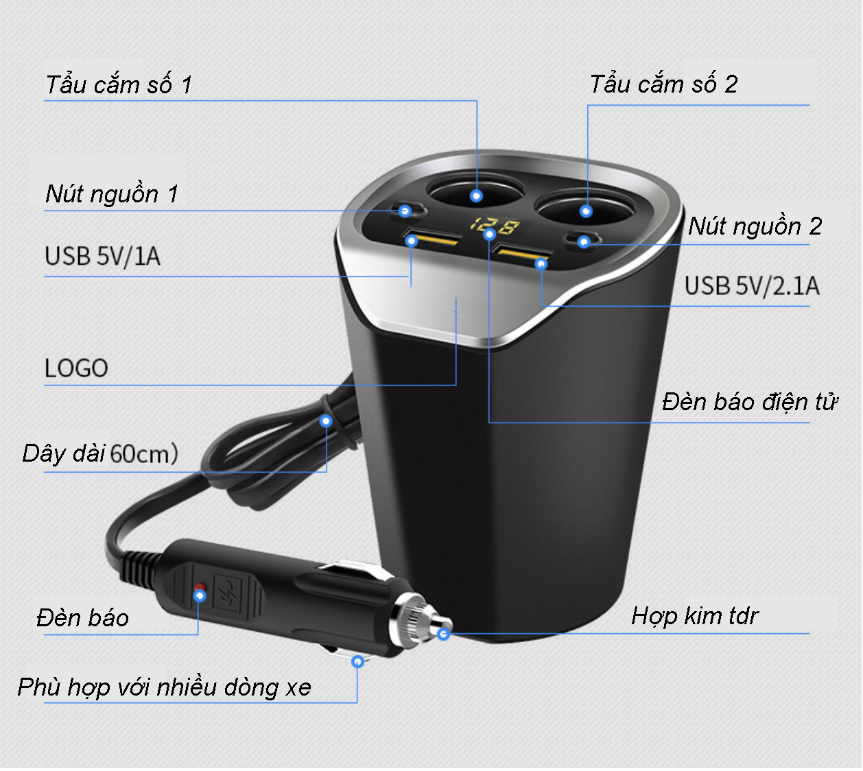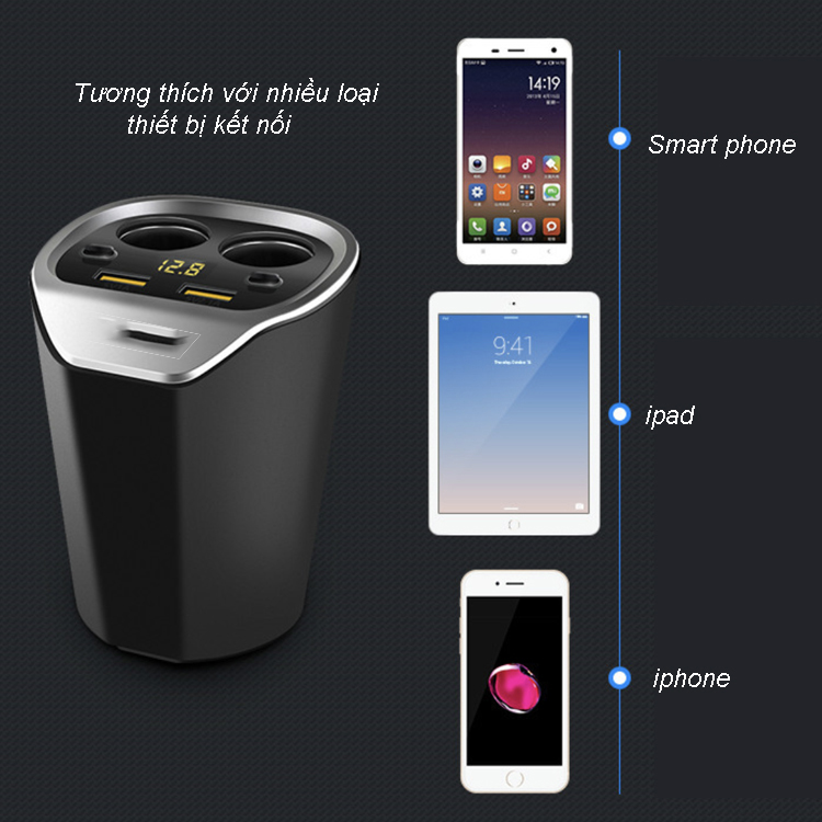 Thỏa mãn khát khao cho những ai thích kết nối nhiều thiết bị trên ô tô. Dùng 1 được 3 giúp bạn kết nối được nhiều thiết bị cùng lúc. 2 cổng mồi thuốc. Mỗi cổng có 1 công tắc ON/OFF riêng. Hỗ trợ sạc nhanh , tối ưu tương thích với nhiều loại thiết bị di động 2 cổng USB (Tổng dòng điện 6.2A)