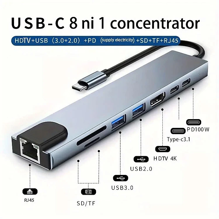 Bộ Chuyển Đổi Hub USB C Hub 8 Trong 1 Type C 3.1 Sang 4K RJ45 Đọc Thẻ SD / TF Cho MacBook Notebook Laptop Máy Tính - Hàng Nhập Khẩu