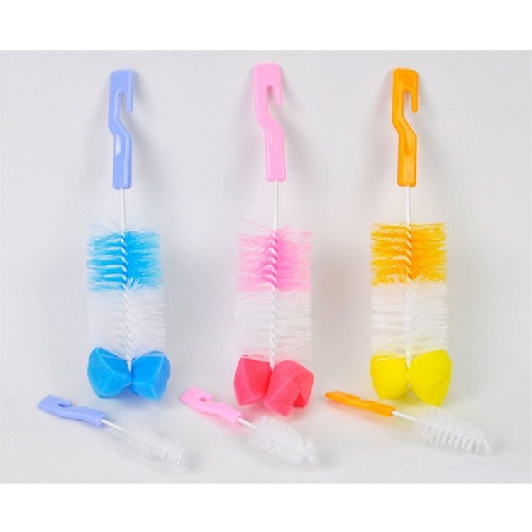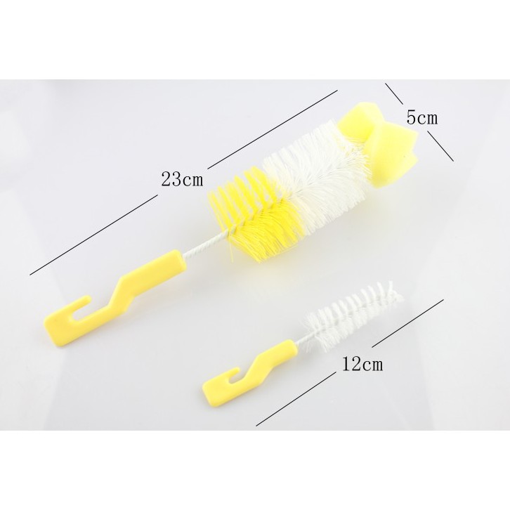 - Bộ cọ rửa bình sữa tiện dụng cho bé gồm 2 chổi cọ: 1 chổi cọ bình sữa đầu cọ bọt biển, 1 chổi cọ núm ti phù hợp với các loại bình sữa và núm ti kích cỡ khác nhau. Chổi lớn giúp bạn cọ sạch được những cặn sữa bám vào thành bình sữa, chổi nhỏ dùng để vệ sinh núm ti, làm sạch các lớp váng sữa còn bám lại bên trong núm ti.