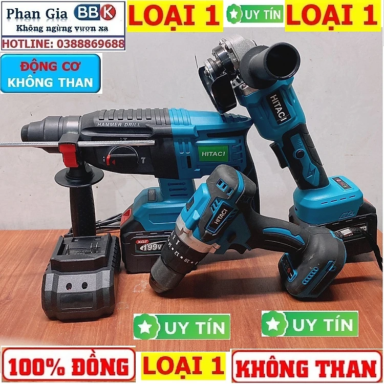 Bộ Combo 3 Món Gồm Máy Khoan Đục Bê Tông, Máy Mài Và Máy Khoan Pin Dùng Pin 199V, 2 Pin 15Cell, Máy Khoan Siêu Khỏe - Bảo Hành 12 Tháng