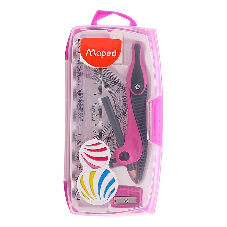 - Bộ sản phẩm gồm compass, chuốt chì, 4 loại thước kẻ hỗ trợ rất nhiều trong bộ môn Toán học.