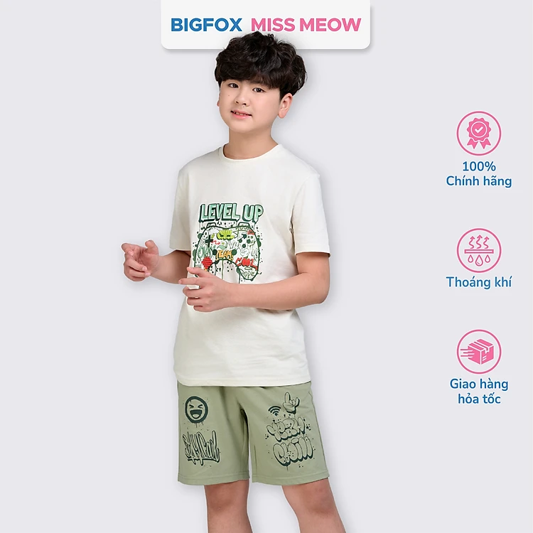 Bộ cotton bé trai size đại Bigfox Miss Meow mùa hè cộc tay in đẹp 12,13,14,15 tuổi 40kg 50kg