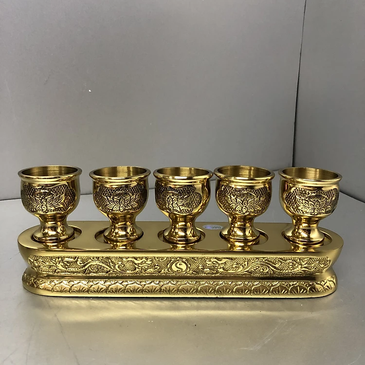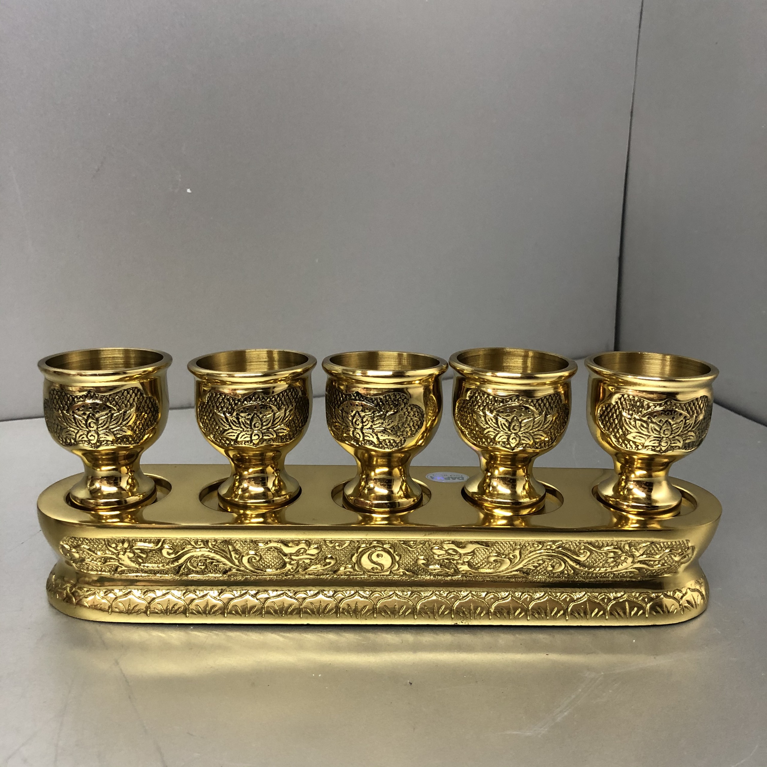Bộ cúng nước 5 ly bằng đồng vàng nguyên chất ; mẫu ly khắc hoa sen