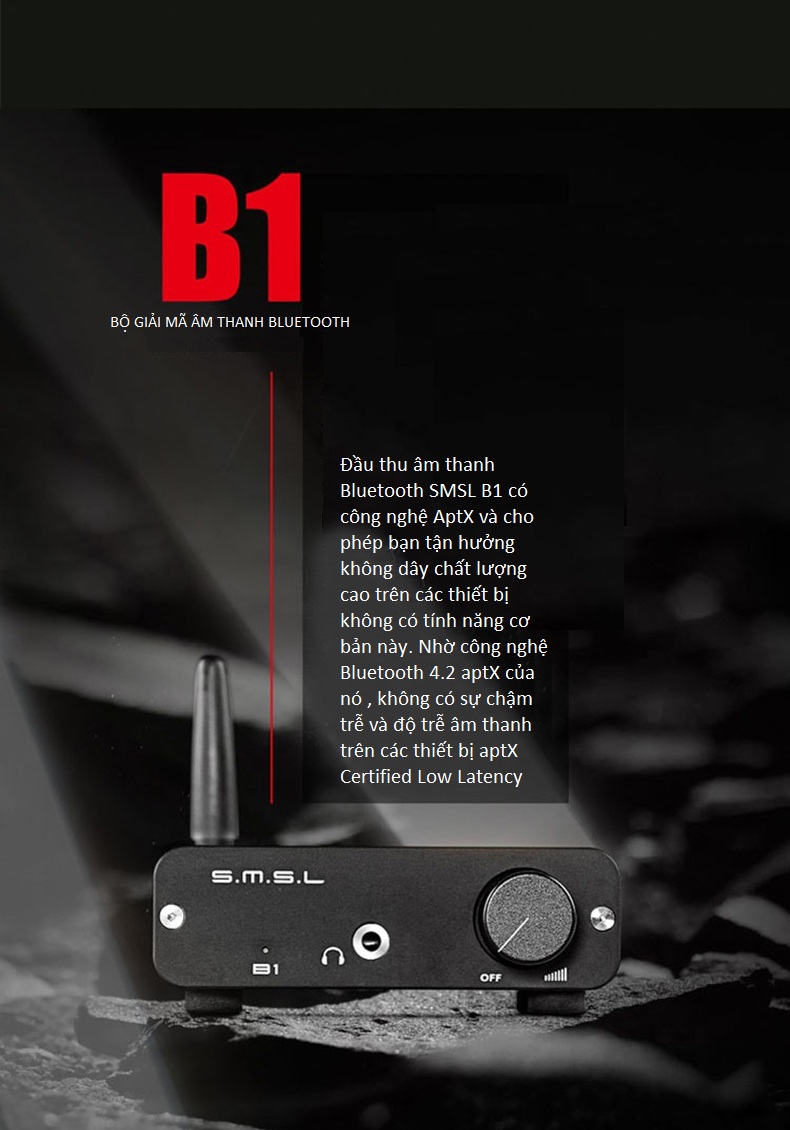Đầu thu âm thanh Bluetooth SMSL B1 có công nghệ AptX và cho phép bạn tận hưởng không dây chất lượng cao trên các thiết bị không có tính năng cơ bản này. Nhờ công nghệ Bluetooth 4.2 aptX của nó , không có sự chậm trễ và độ trễ âm thanh trên các thiết bị aptX Certified Low Latency.