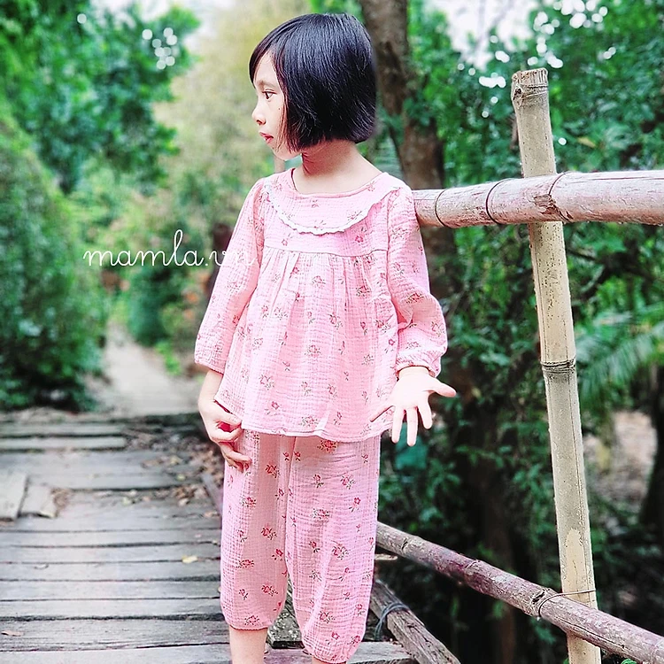 Bộ dài tay hoa nhí cổ đính viền ren vải xô muslin cao cấp cho bé gái MamLa