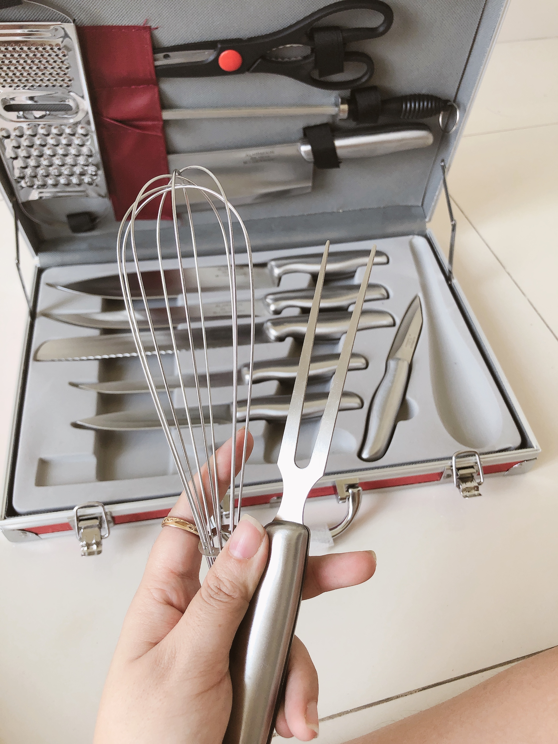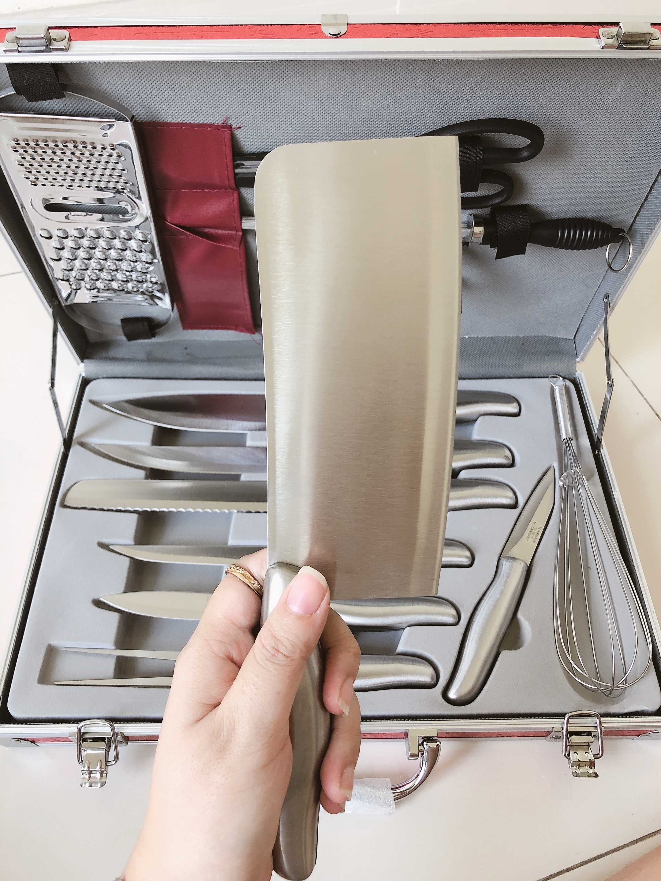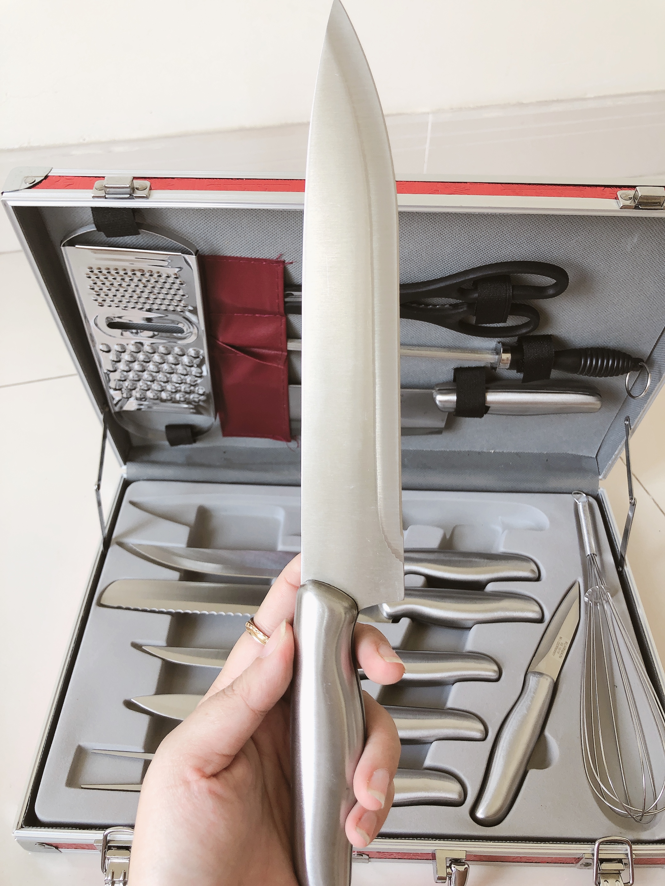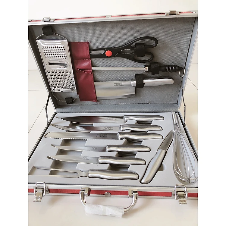 Bộ dao 13 món cao cấp ( dùng cắt thịt, cá, bánh mì, trái cây ...,kéo, đồ đánh trứng và dao bào) làm bằng chất liệu thép không gỉ - đựng trong vali sang trọng