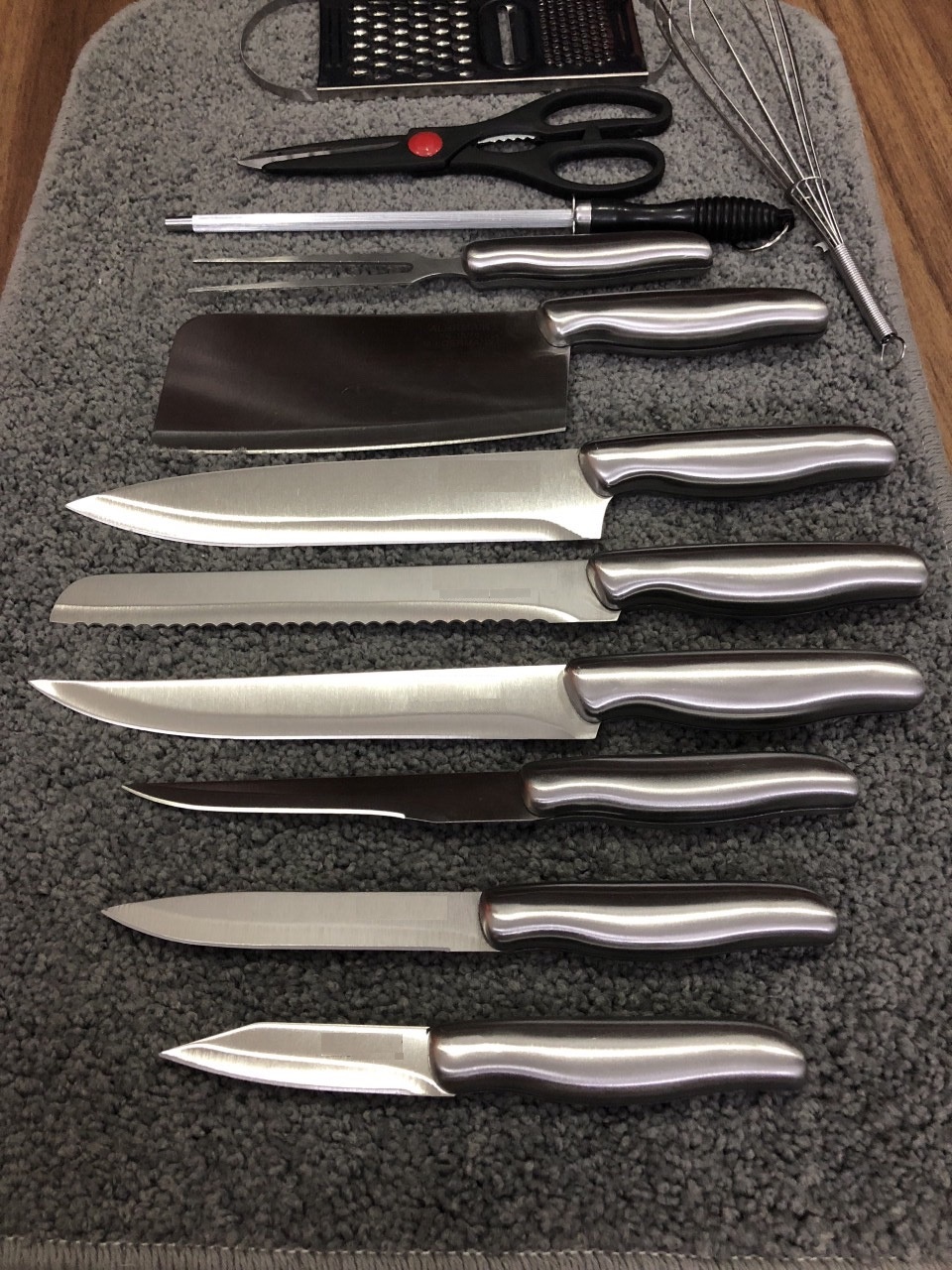 - Có đủ loại dùng cắt thịt, cá, bánh mì, trái cây … Có cả kéo, đồ đánh trứng và dao bào.