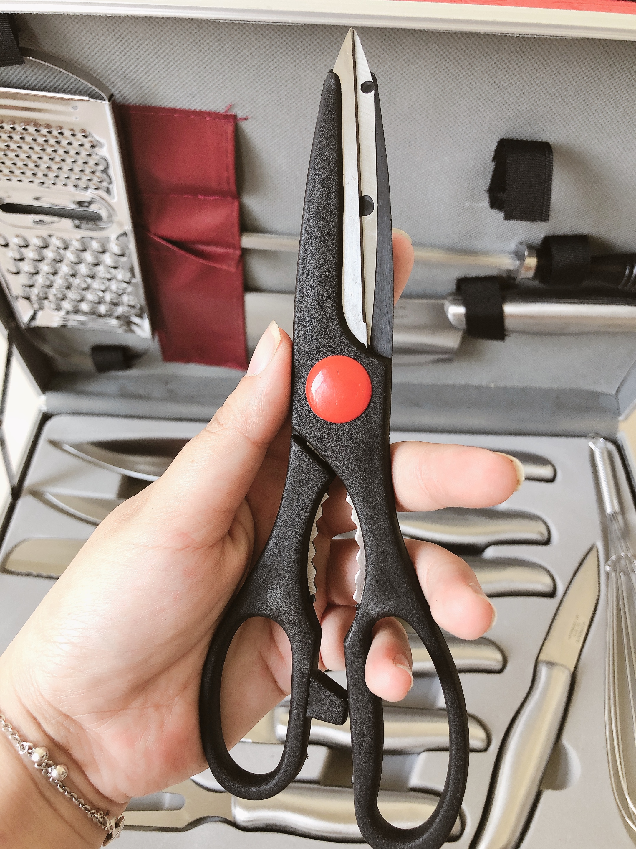 - Bộ dao đa năng được làm bằng thép cao cấp có độ bền rất cao, cầm chắc tay và rất an toàn đối với người sử dụng. Ngoài ra, chiếc kéo làm bếp đa năng có đầu nhọn, xẻ rãnh trên lưỡi kéo và phần tay cầm có khoét lõm hình răng cưa giúp bạn làm cá, mực, cắt đầu tôm nhanh chóng