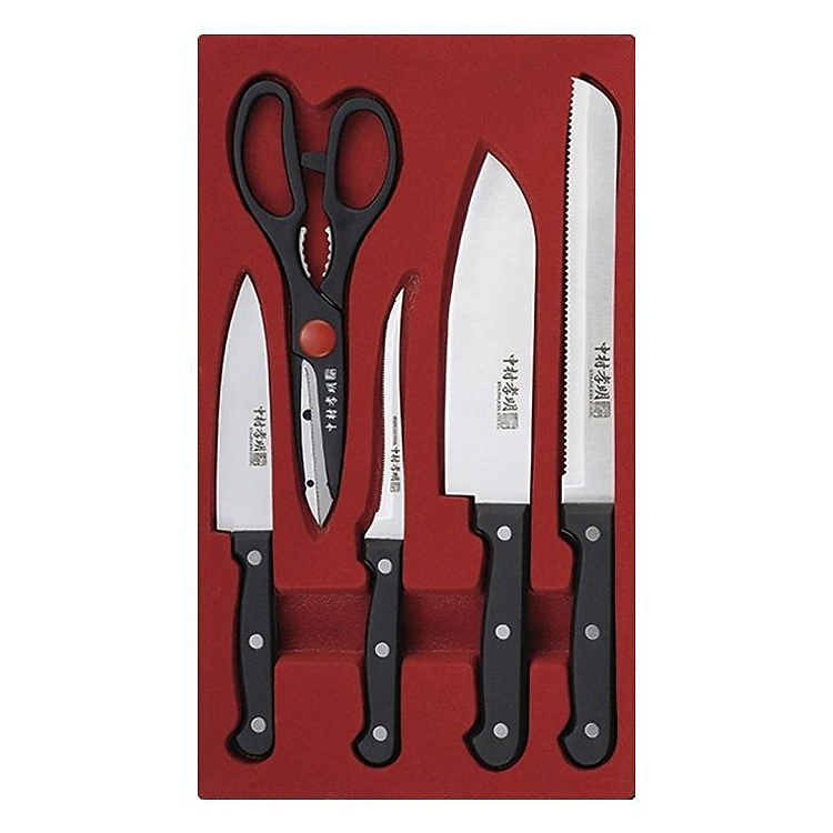 Bộ dao thép không gỉ 5 món gồm 4 cây dao, kích thước 26x7cm, 26x4cm, 18,5cm, 16cm, 1 cây kéo kích thước 20x7cm, được làm từ chất liệu thép không gỉ có độ bền cùng độ sắc bén cao, cho vết cắt mịn, không bị ăn mòn hay hoen gỉ sau một thời gian sử dụng.