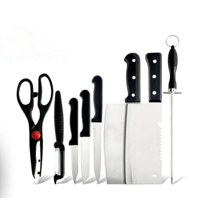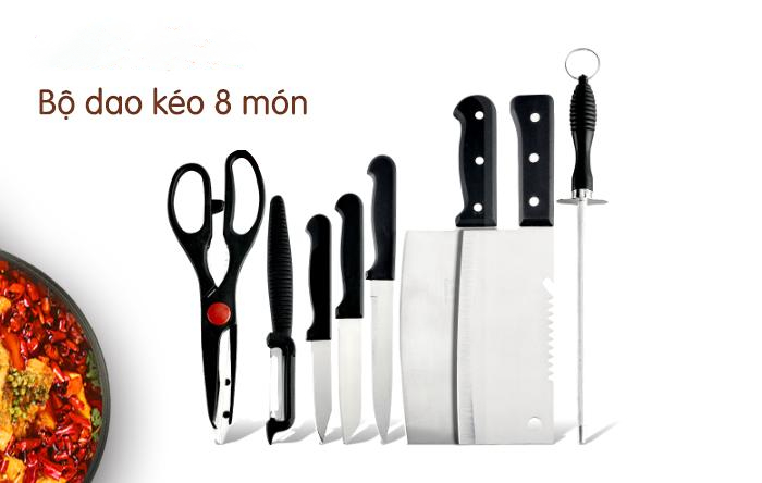 Để có một bữa ăn nhanh chóng thì dao, kéo là vật không thể thiếu dành cho nhà bếp. Những chiếc dao kéo cùn hay gỉ làm bạn mất thời gian trong việc chế biến mà lại không đảm bảo vệ sinh ăn uống cho cả gia đình. Một bộ dao kéo chất lượng là mong muốn của nhiều mẹ nội trợ hiện nay. Bộ dao kéo 8 món bằng thép không gỉ, sáng bóng, sang trọng và tinh tế, bền lâu, bộ dao sẽ giúp cho công việc nhà bếp của bạn trở nên nhẹ nhàng và thoải mái hơn.
