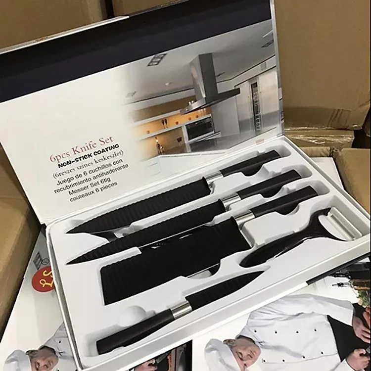 Bộ Dao Làm Bếp 6 Món Thép Đen Cao Cấp Nhập Khẩu Đức là một thương hiệu của dụng cụ nhà bếp chuyên nghiệp ở nước ngoài. Bộ dao bao gồm: dao đầu bếp, dao sashimi, dao làm bếp, dao gọt hoa quả, kéo và nạo vỏ. Được làm bằng vật liệu thép không gỉ chất lượng cao (X30Cr13), an toàn, không độc hại khi tiếp xúc trực tiếp với thực phẩm. Độ cứng cao, chống ăn mòn, chống oxy hóa, không rỉ sét và lưỡi dao cực kỳ sắc bén. Bề mặt lưỡi dao lượn sóng độc đáo và sáng tạo, cho phép không khí lưu thông giữa thực phẩm và bề mặt dao để giảm ma sát khi cắt. Dù cắt hay thái hạt lựu, bất kỳ thực phẩm nào cũng có thể rơi nhẹ và không dính vào bề mặt dao.Vì vậy việc cắt thái chở nên dễ dàng hơn, ngay cả những miếng phô mai lớn hay bất kỳ thành phần cứng và mềm nào như bánh mì hoặc cà chua đều có thể dễ dàng cắt, không chỉ giúp tiết kiệm sức mạnh cổ tay của bạn, mà còn ngăn ngừa rau quả tươi Hư hỏng, giữ dinh dưỡng. Tay cầm silicon, thoải mái, không trơn trượt, cấu trúc, dễ sử dụng. Đây là bộ dao nhà bếp mang tính cách mạng.