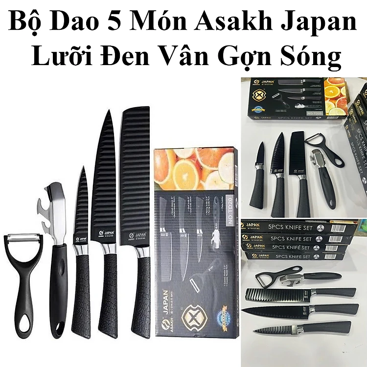 Bộ Dao Nhà Bếp 5 Món Asakh-Japan Lưỡi Đen Vân Gợn Sóng