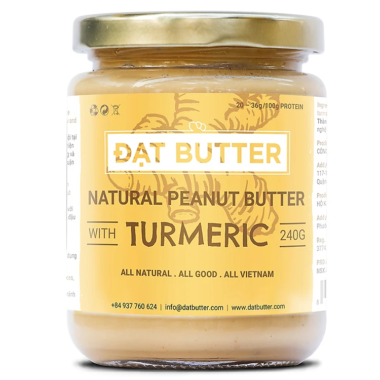 • Bơ Đậu Phộng Tự Nhiên Vị Nghệ Đạt Butter (240g) là sản phẩm có chiết xuất hoàn toàn từ tự nhiên với tỉ lệ 94% đậu phộng (hay còn gọi là lạc), 3% mật ong nguyên chất thuần tự nhiên 2% nghệ và 1% là muối. Những nguyên liệu sử dụng trong chế biến thành bơ đậu phộng vị nghệ đều được kiểm soát nghiêm ngặt bởi Đạt Butter nên an toàn cho người dùng.