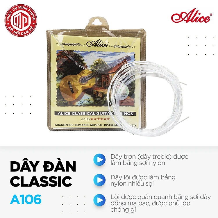 Bộ dây đàn Guitar Classic/ Classical Guitar String Set - Alice AC106/ A106 - Clear Nylon Plain String, Silver Plated Copper Alloy Winding - Hàng chính hãng