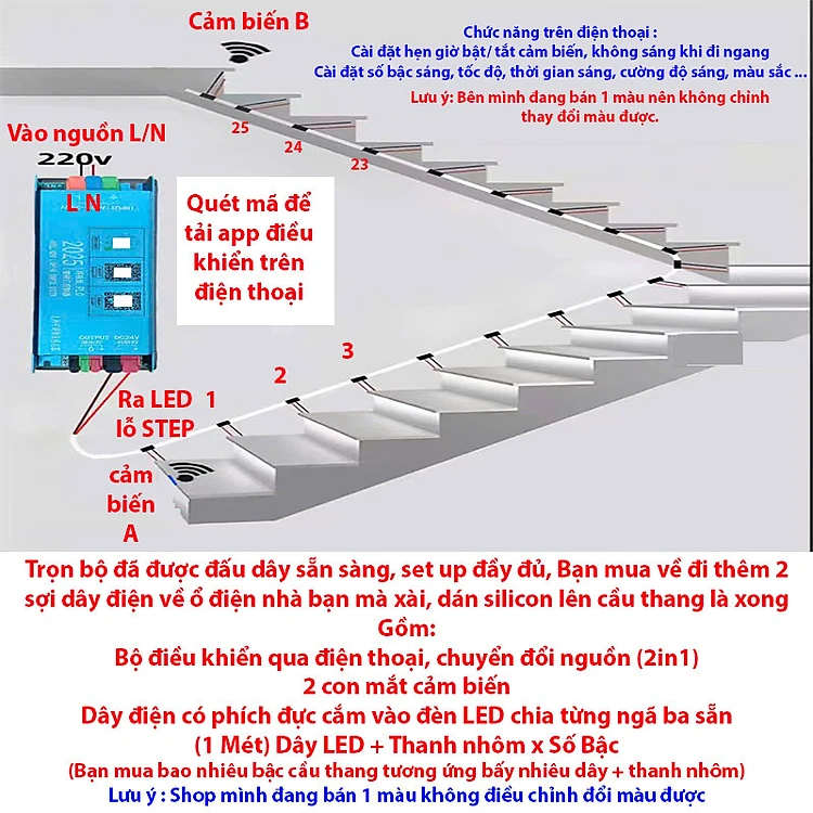 Bộ đầy đủ Đèn LED cầu thang thông minh cảm ứng. Đèn LED bước cầu thang cảm ứng cơ thể con người