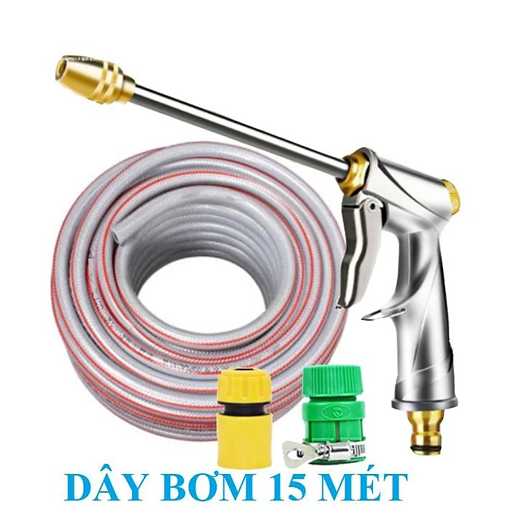 Bộ dây vòi xịt nước rửa xe, tưới cây . tăng áp 3 lần, loại 15m 206318 đầu đồng,cút,nối vàng + tặng đai