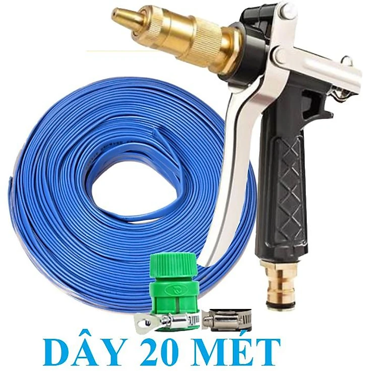Bộ dây vòi xịt nước rửa xe, tưới cây . tăng áp 3 lần, loại 20m 206236 đầu đồng, đai, nối vòi vàng