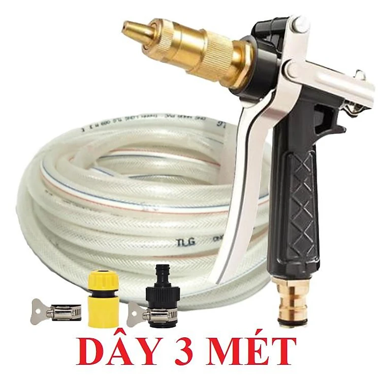 Bộ dây vòi xịt nước rửa xe, tưới cây , tăng áp 3 lần, loại 3m, 5m 206236 đầu đồng,đai,nối nhựa đen+ mở chai