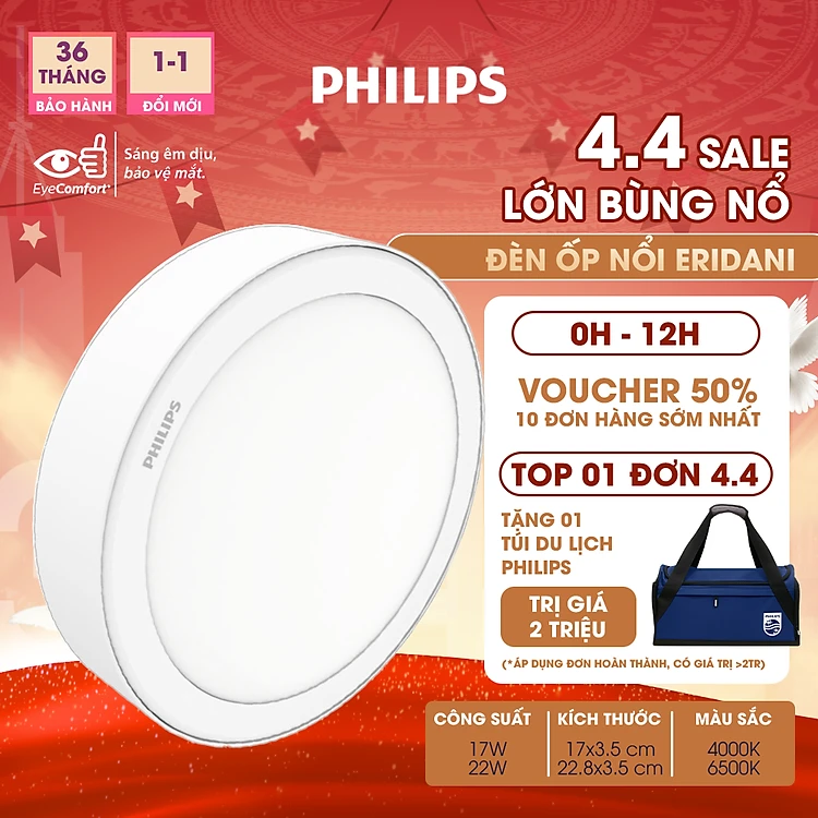Bộ đèn ốp nổi Philips LED Eridani bảo vệ mắt, hiệu suất ánh sáng cao - Công suất (17W, 22W), Ánh sáng trung tính, trắng
