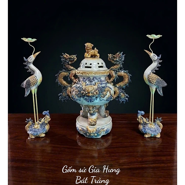 Bộ Đỉnh hạc Tam sự Chân đồng Men rạn Đắp nổi - Gốm sứ Bát Tràng