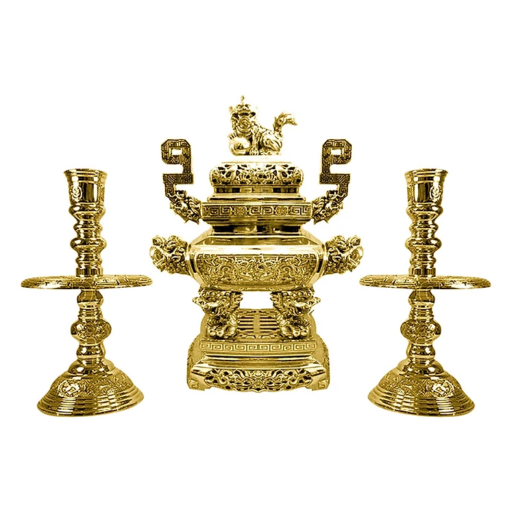 - Lư hương cùng hai chân nến giúp tạo thế kiềng vững chắc nhằm chấn hưng cho không gian thờ cúng, hình ảnh con nghê trên đỉnh lư mang thông điệp bảo vệ, xua tan tà khí xâm nhập.