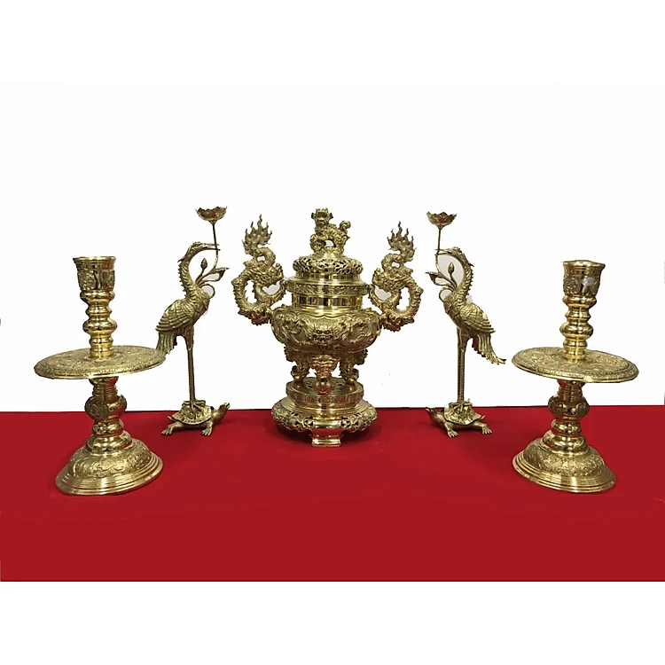 Bộ đỉnh bày bày thờ gia đỉnh , bộ ngũ sự gồm 1 đỉnh + 2 hạc + 2 nến đồng